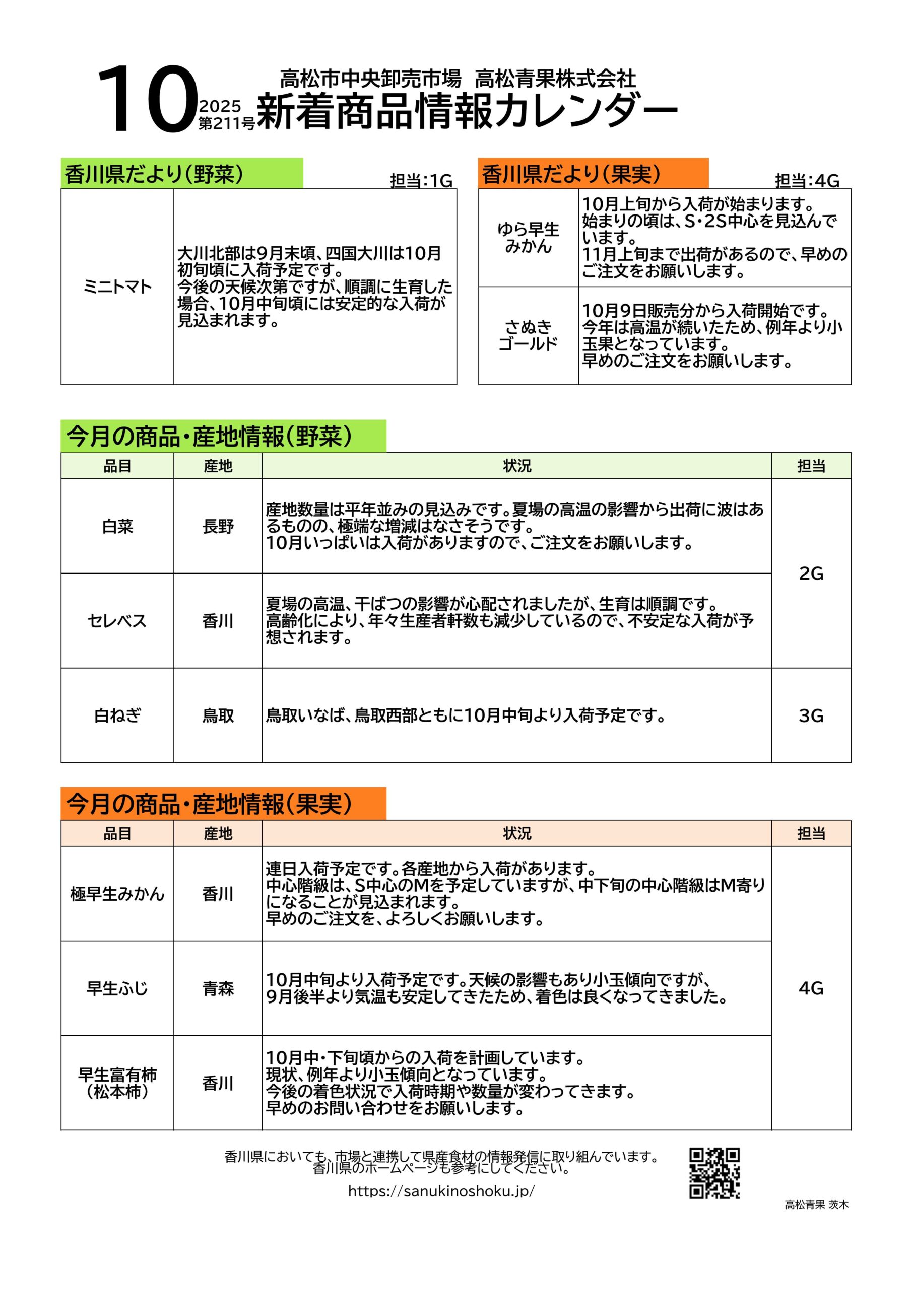 2025.10.01 お知らせ 「情報カレンダー 10月号」をアップしました 10月1日、主に買受の方々向けの「情報カレンダー10月号」を発行しました。 青果物の生育情報をはじめ今後の見通しについてまとめています。 情報カレンダーは、こちらからご覧ください(PDFが開きます) R7.10月情報カレンダーPDF 一覧に戻る