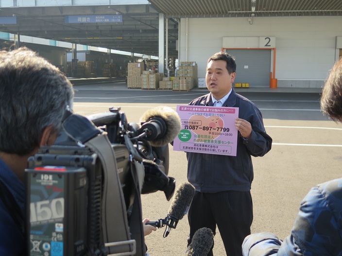 11月27日、公益財団法人かがわ被害者支援センターと、香川県警の皆様により、「かがわ被害者支援ステッカー交付式」を高松市中央卸売市場にて開催していただき、齊藤社長をはじめ、Let’s SDGsプロジェクトメンバーが出席しました。