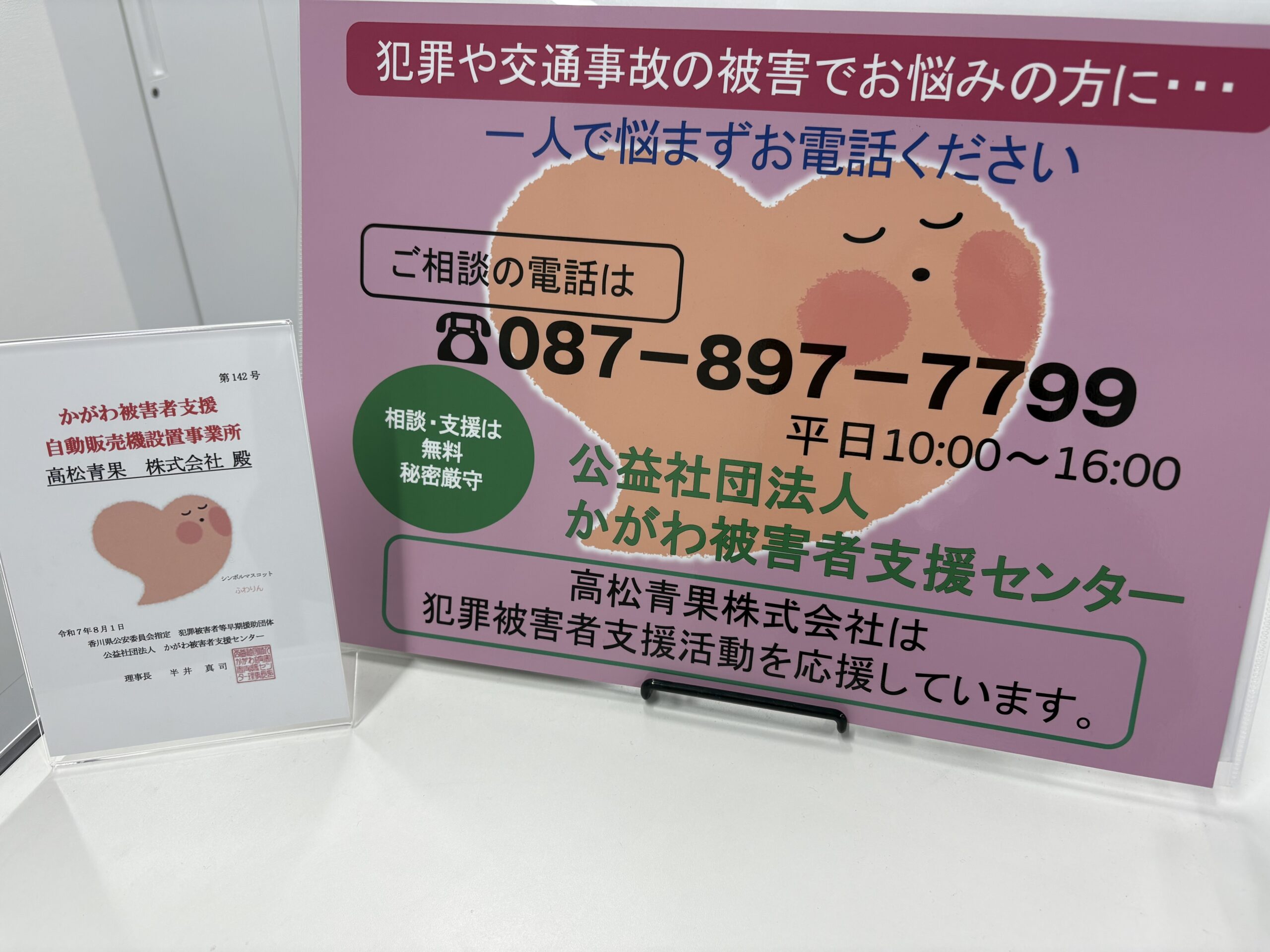当社では、今年8月より、被害者支援自販機を設置させていただいた中で、今回交付されたステッカーは、当社の社用車に貼付し、地域を走る「広告塔」として、犯罪被害者支援の啓発に貢献する、香川県内初の取り組みとなります。