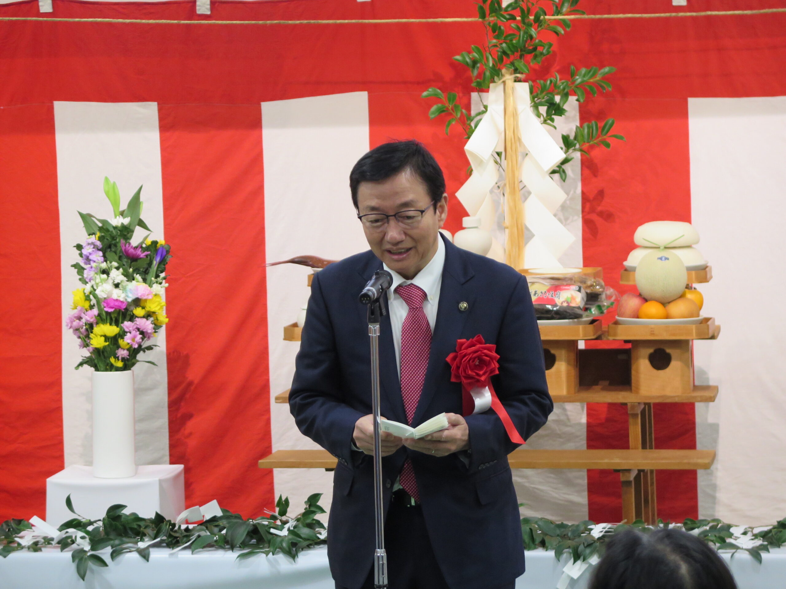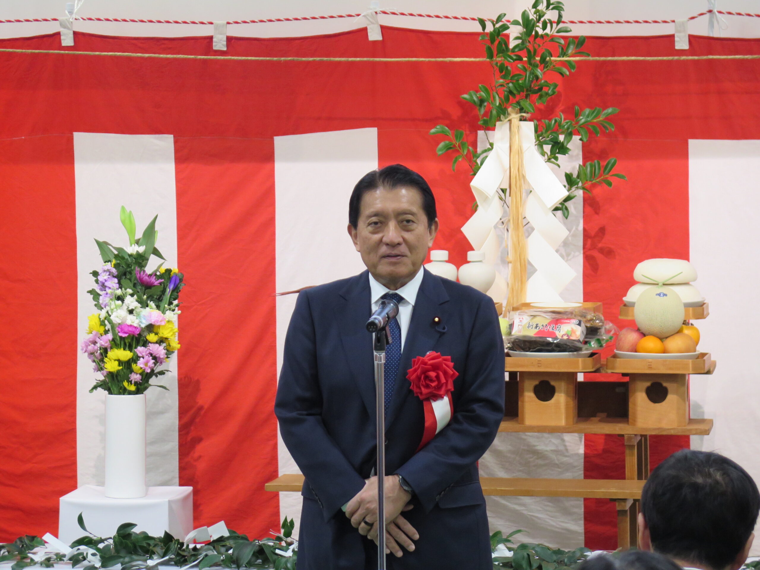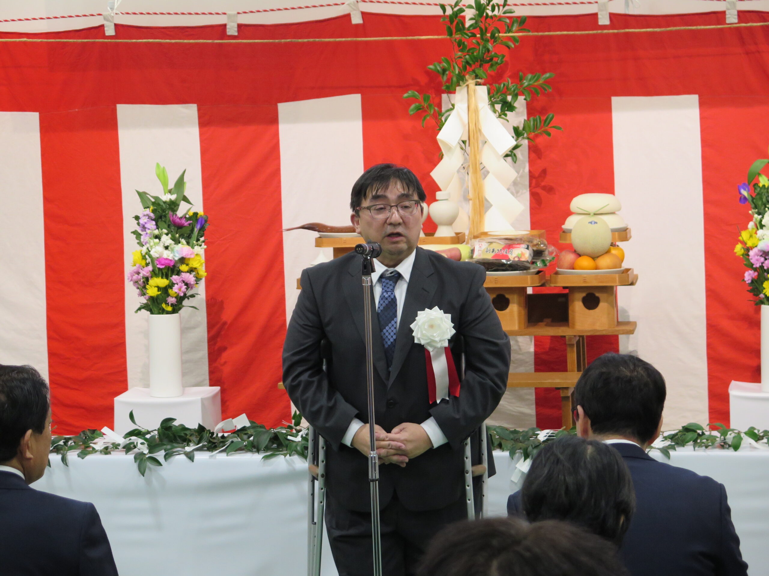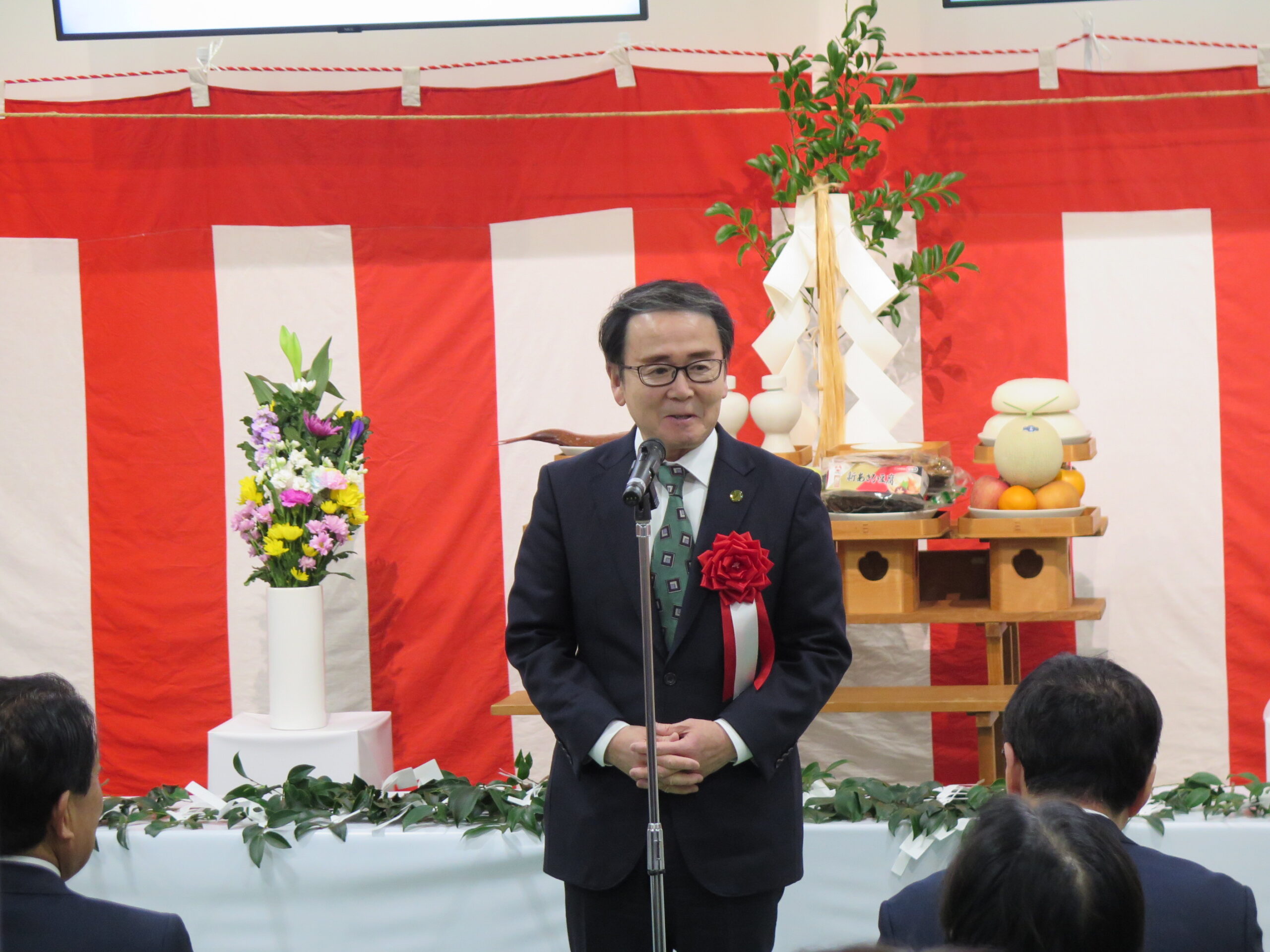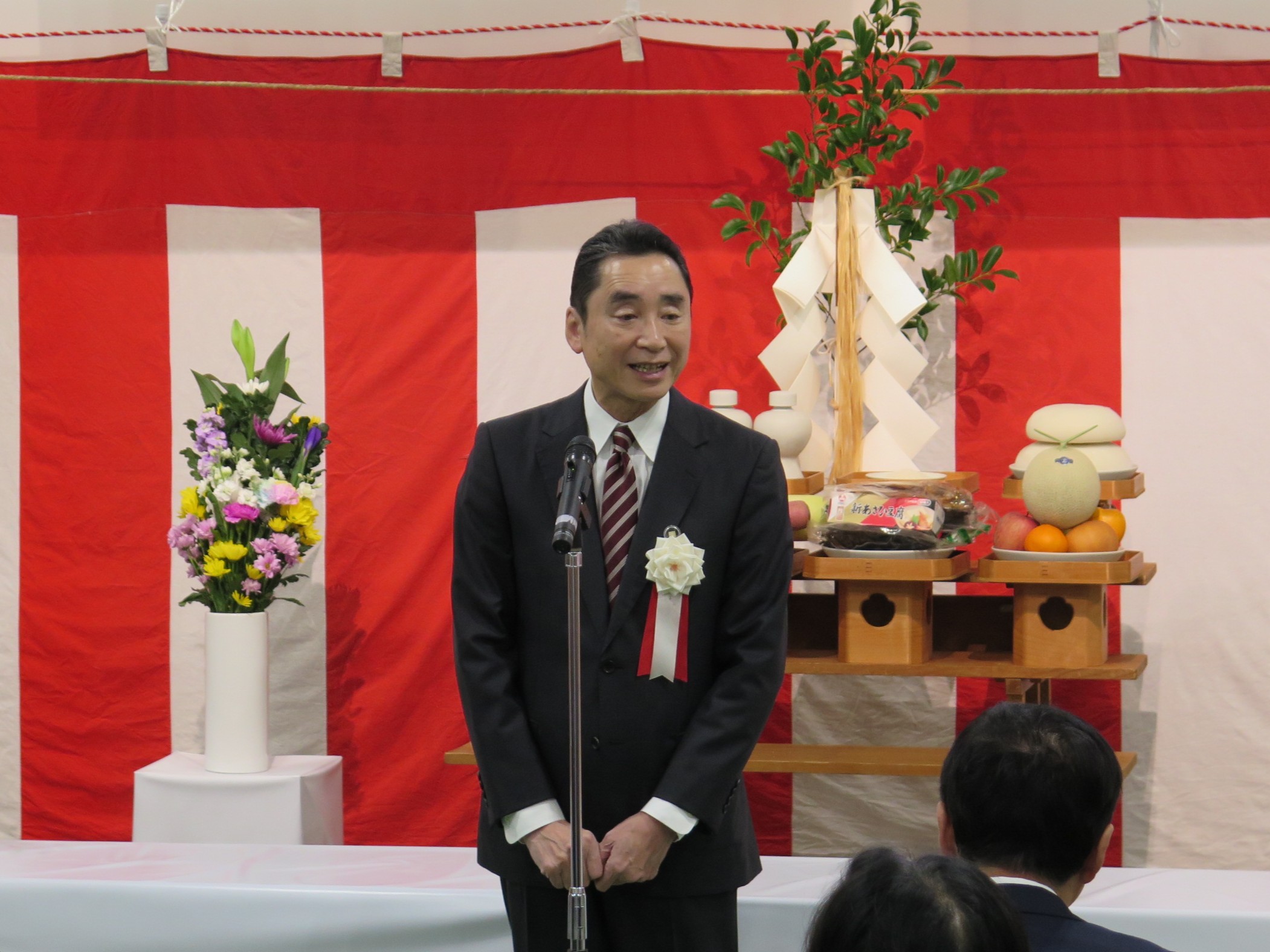 式典では、まず同市場運営協議会副会長である当社齊藤社長の開式の挨拶があり、その後、神事に続き同市場運営協議会 山本会長、開設者である大西高松市長からご挨拶をいただきました。さらに、来賓として平井卓也衆議院議員、池田香川県知事よりご祝辞を賜りました