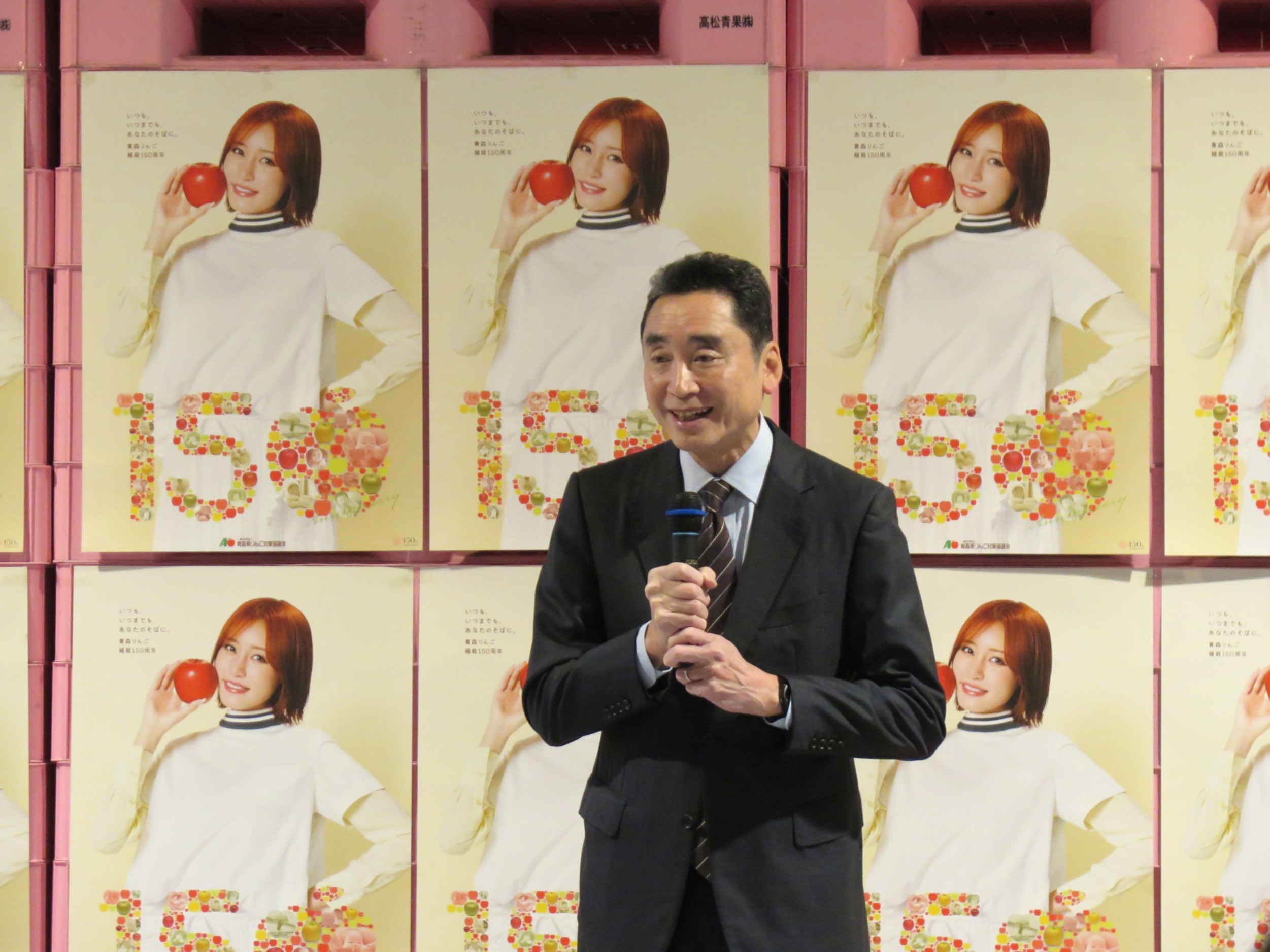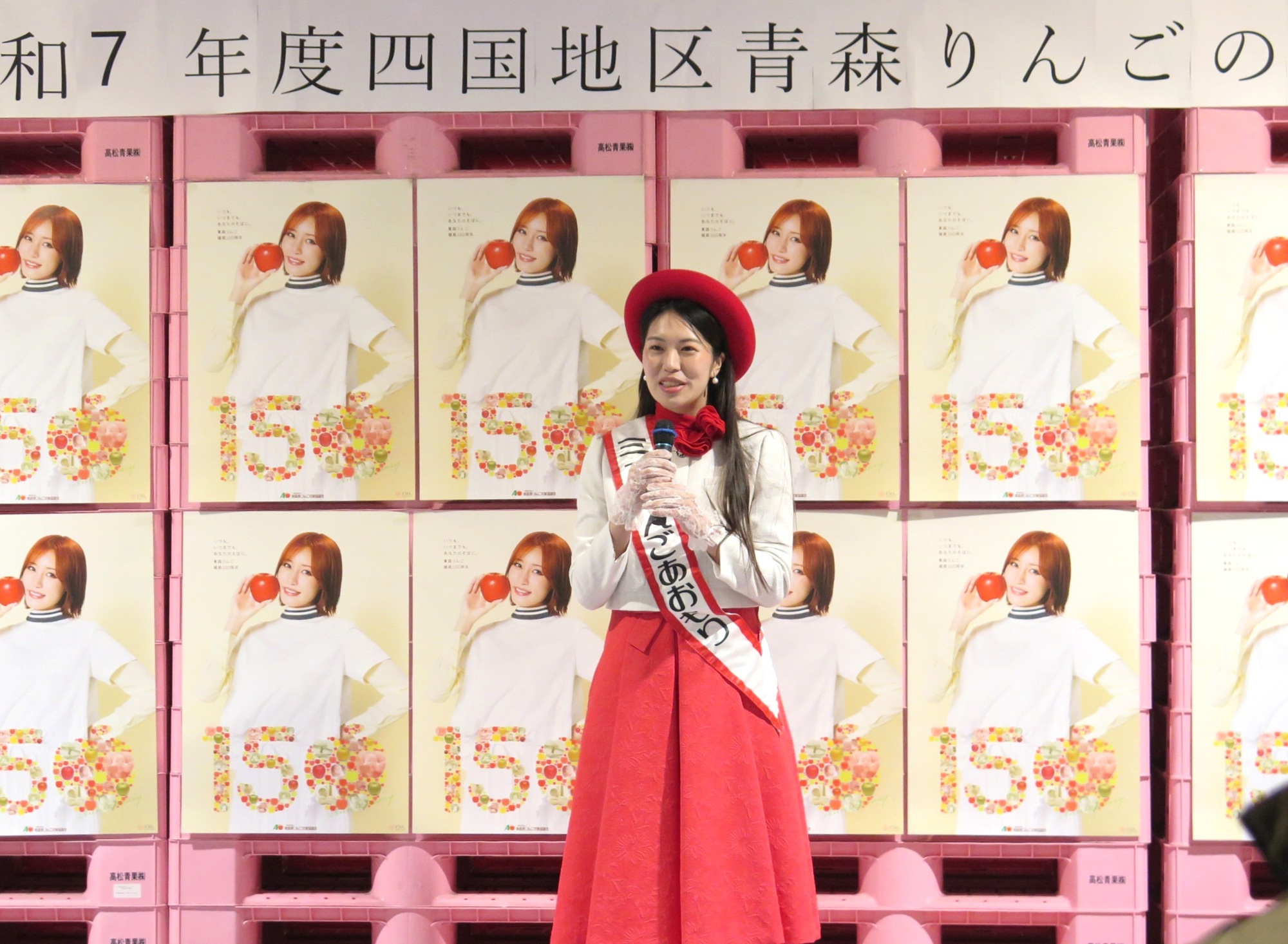 今回、青森から一般社団法人青森県りんご対策協議会より、ミスりんご青森の下田 来渚さんにお越しいただきました。早朝には、セリ開始前の弊社果実売場にて、仲卸や売買参加者の皆さまを前に、旬を迎えた青森県産りんごのPRされました。